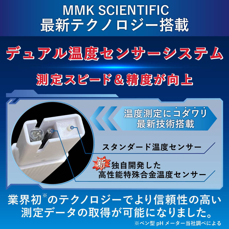- 🔶【最新技術・デュアル温度センサーシステム】2本の異なる温度センサーが迅速・高精度な温度測定を可能にしました。ペン型pHメーターでは日本初の当社独自の最新技術です。
